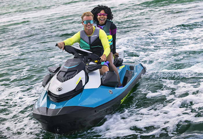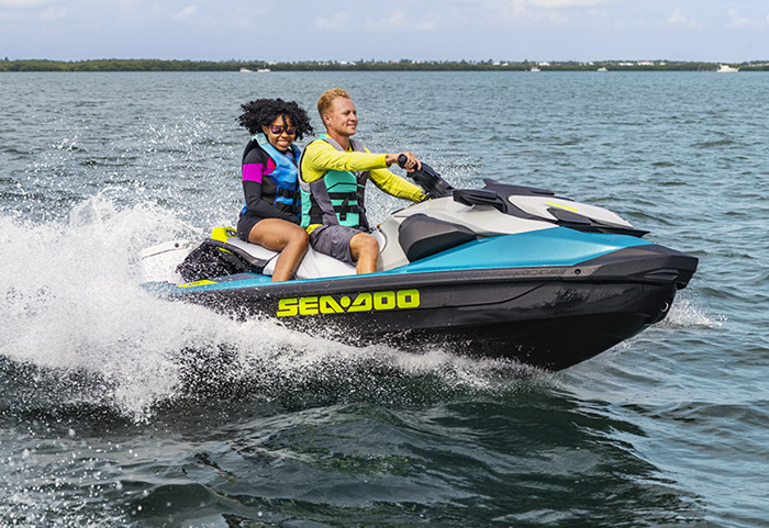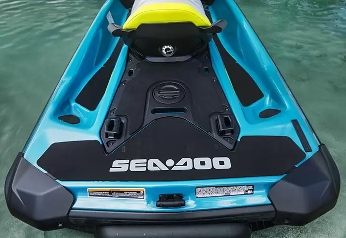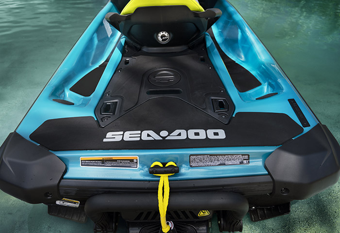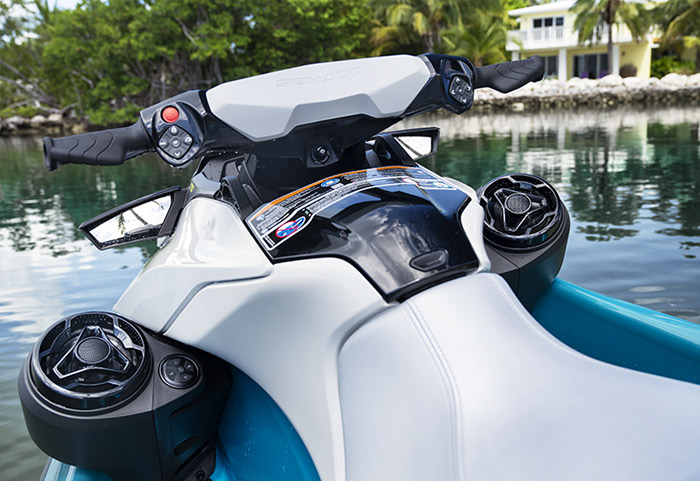 Equipado com compartimento estanque para celular, ampla plataforma de popa com sistema LinQ de engate rápido de acessórios, assento Ergolock bi-partido, compartimento frontal de acesso direto de 144 L, escada de reembarque e sistema de áudio Premium BRP opcional.