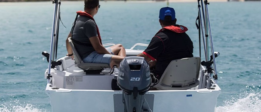 Motor de popa com 2 cilindros em linha, carburado, possui partida manual e manche. Possui duas opções de ajuste manual no ângulo de inclinação, possibilitando a navegação em águas rasas. Possui sistema de segurança de partida, bloqueando o movimento da embarcação com o motor engatado, evitando o deslocamento inesperado.